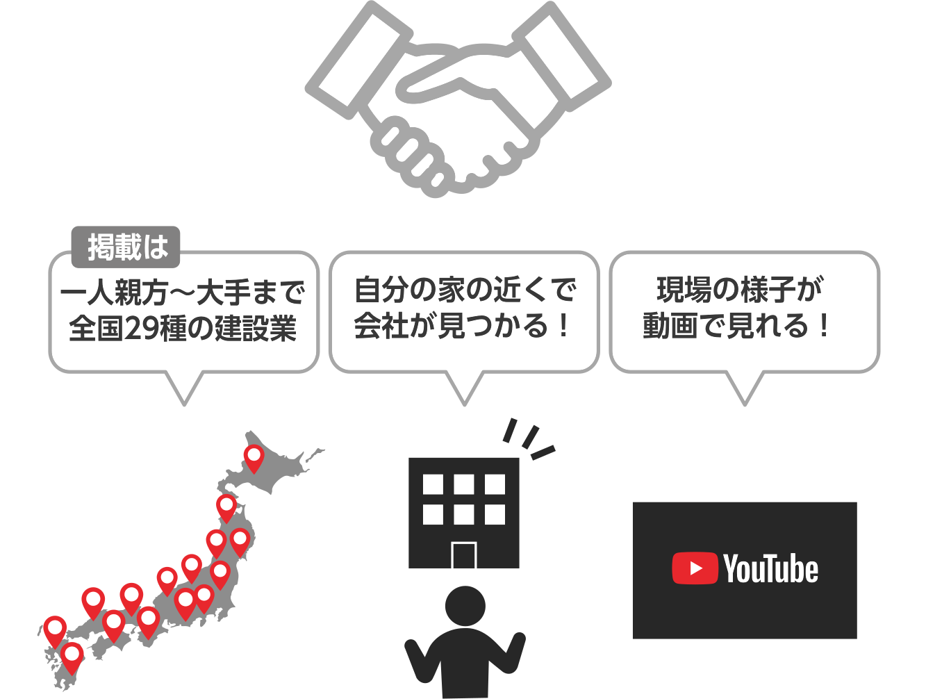 求人道場は、全国の『建設業で働きたい人』と全国の『人材を求める全29種の建設業者』をつなぐマッチングサイトです。 当道場では、一人親方をはじめ大手企業まで、全国の建設業者が多数登録しているので、自分の希望に合った仕事が自分の生活圏内で探せます。 当道場の特徴は、就業イメージがつきやすい企業側の『動画掲載』です。会社や現場の様子を動画で確認して、あなたの職場選びにお役立てください。